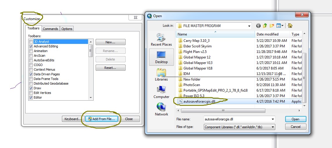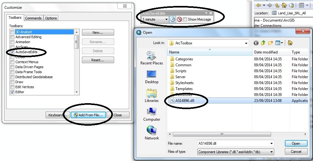 Tool tersebut berbentuk file library atau *.dll langsung bisa ditambahkan lewat toolbar ArcGIS tanpa harus menginstal terlebih dahulu. Ada beberapa pilihan dalam tool Auto Save Edit yaitu waktu pengingat 1 menit, 3 menit, 5 menit, dan seterusnya, tomblo Turn On dan Turn Off, dan tombol show message dialoge box. Cara menambahkan tool untuk ArcGIS 9.x dan ArcGIS 10 , masuk ke menu Customize -> Customize Mode -> muncul jendala baru pilih Add From File -> pilih file “AS14896.dll” lalu pilih add, tunggu beberapa saat setelah itu chek list di pilihan toolbar yang akan ditambahkan lalu close. Extensi akan aktif ketika kondisi dalam proses Editor atau ketika membuat shape atau mengedit data shapefile atau feature class.