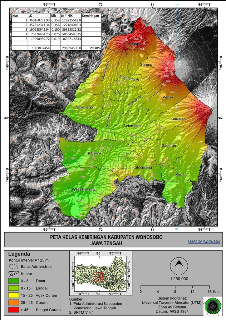 sebenarnya peta di atas itu ingin mencari nilai kemiringan dari Kabupaten Wonosobo atau bisa dibilang nilai rata-rata kemiringan lereng Kabupaten Wonosobo. jika tujuan akhir proses hanya ingin mencari kelas kemiringan saja maka tidak perlu perhitungan seperti di atas, langsung dibuat per kelas kemiringan saya dan di layout seperti tampilan pada legenda peta diatas.